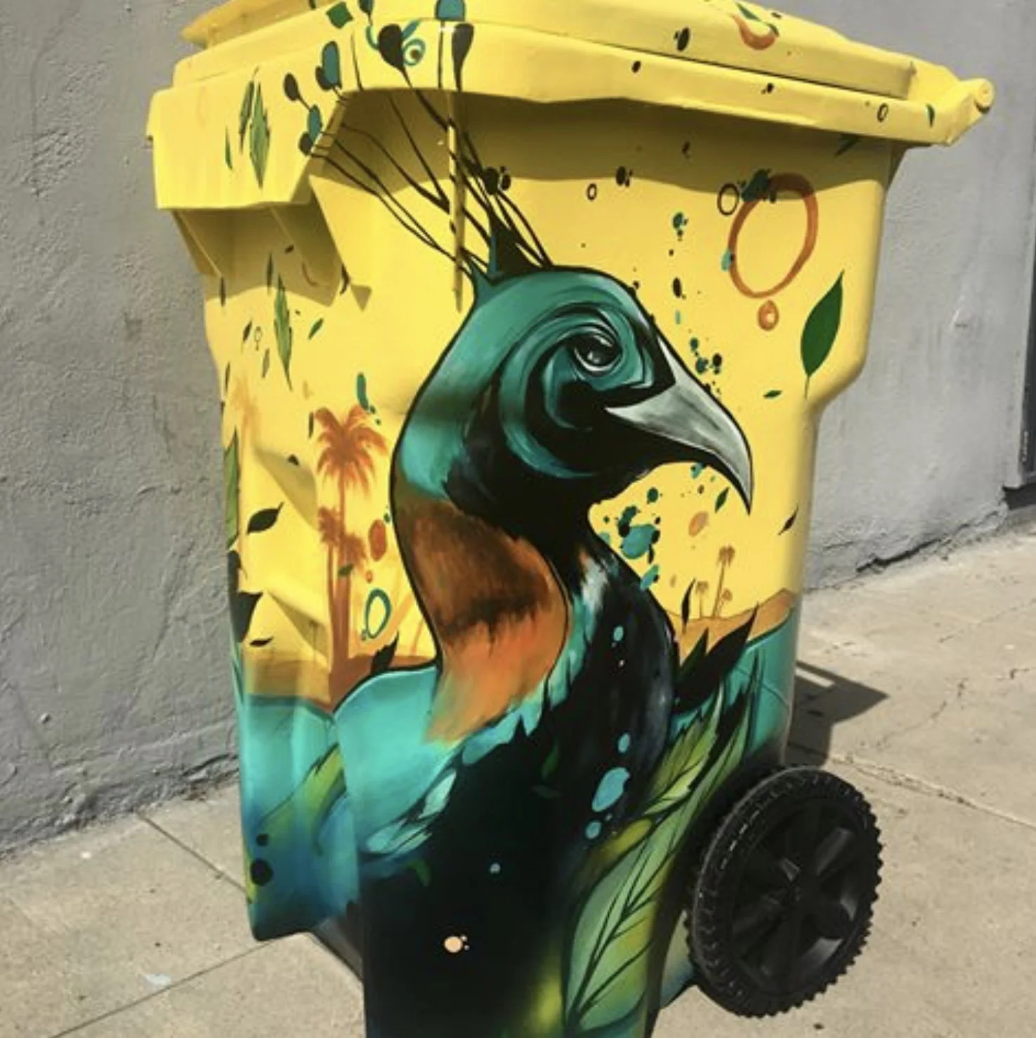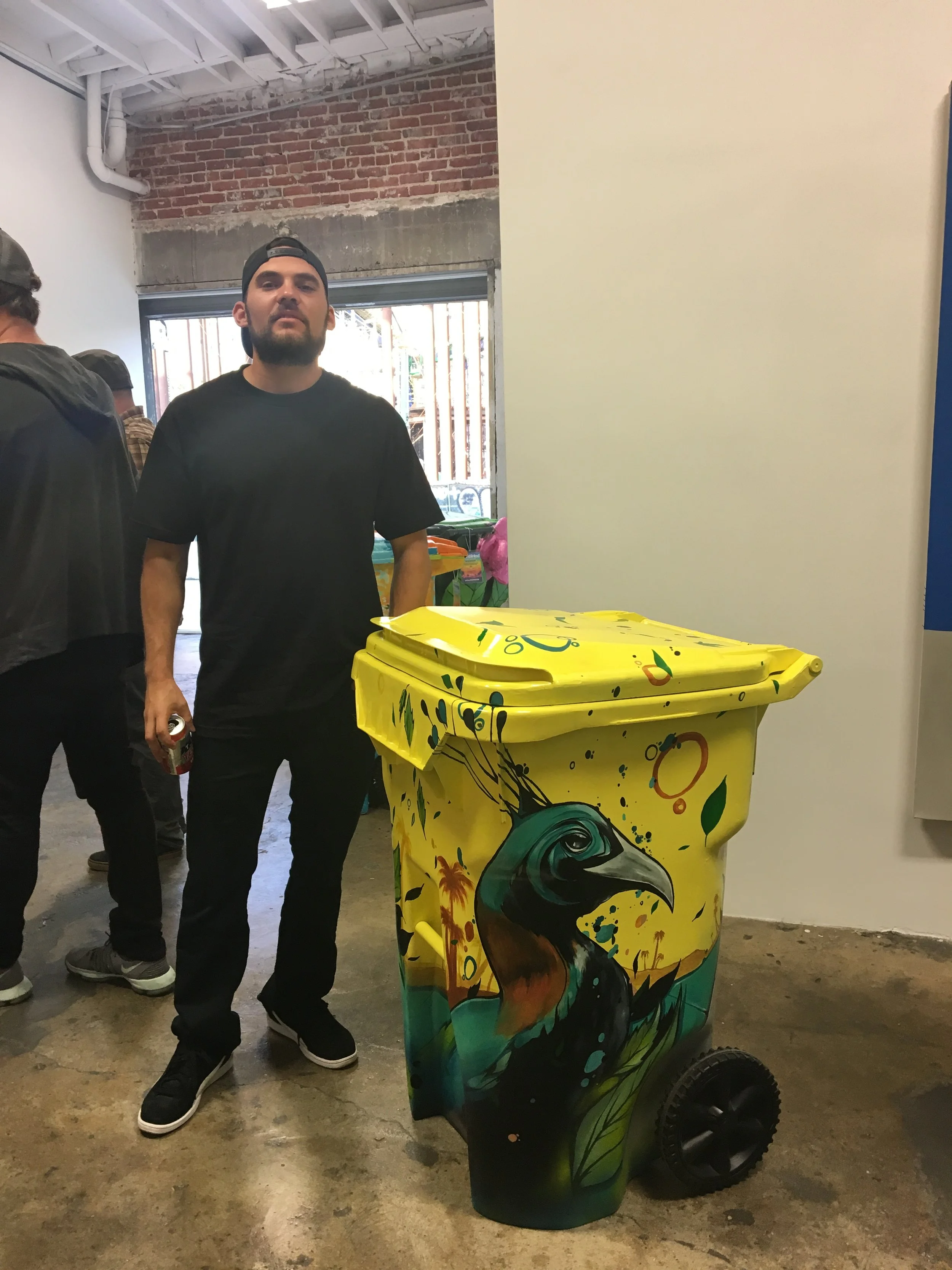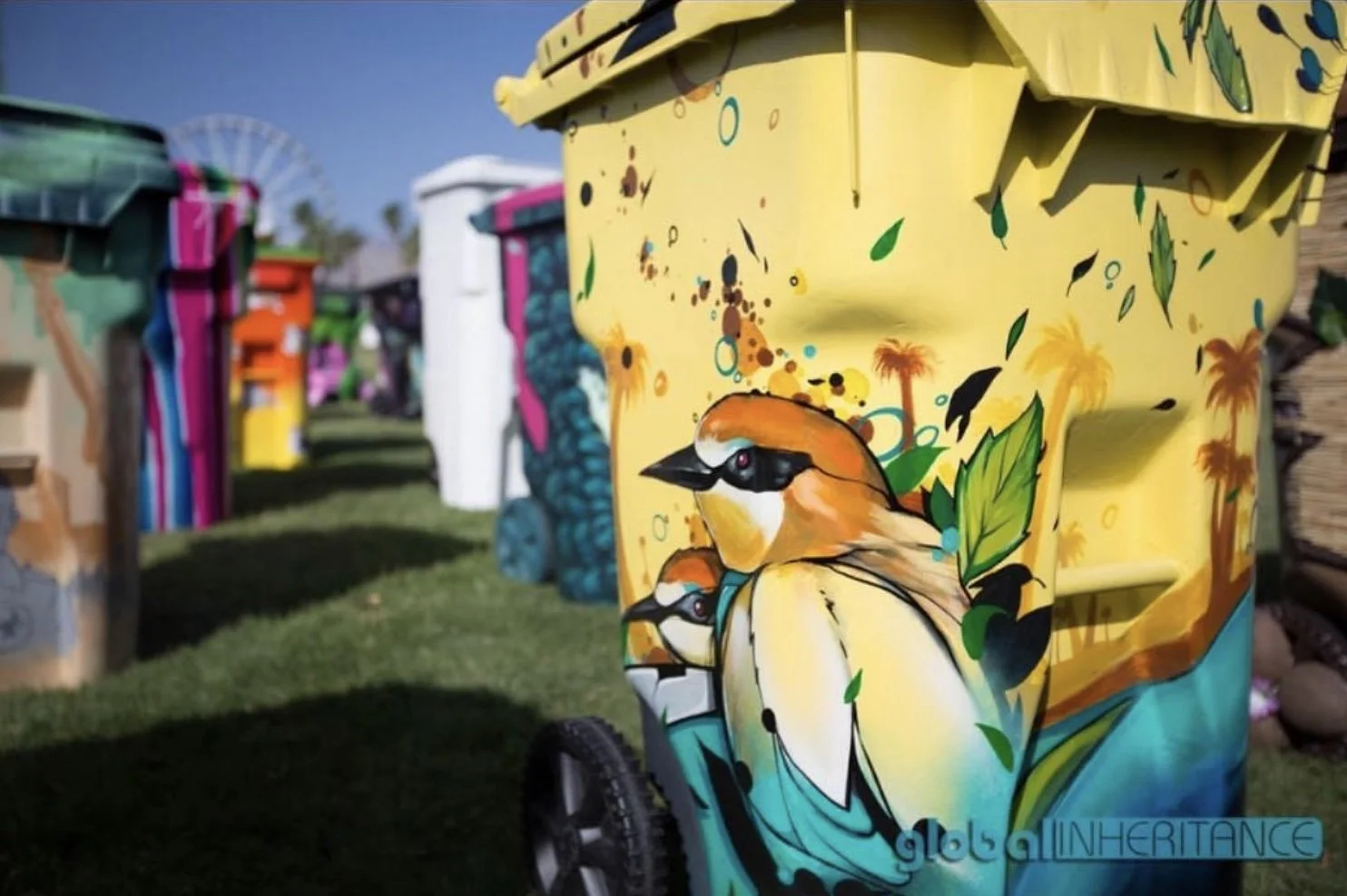 Painted recycle bins for Global Inheritance to bring awareness to recycling on display at Coachella 2018.